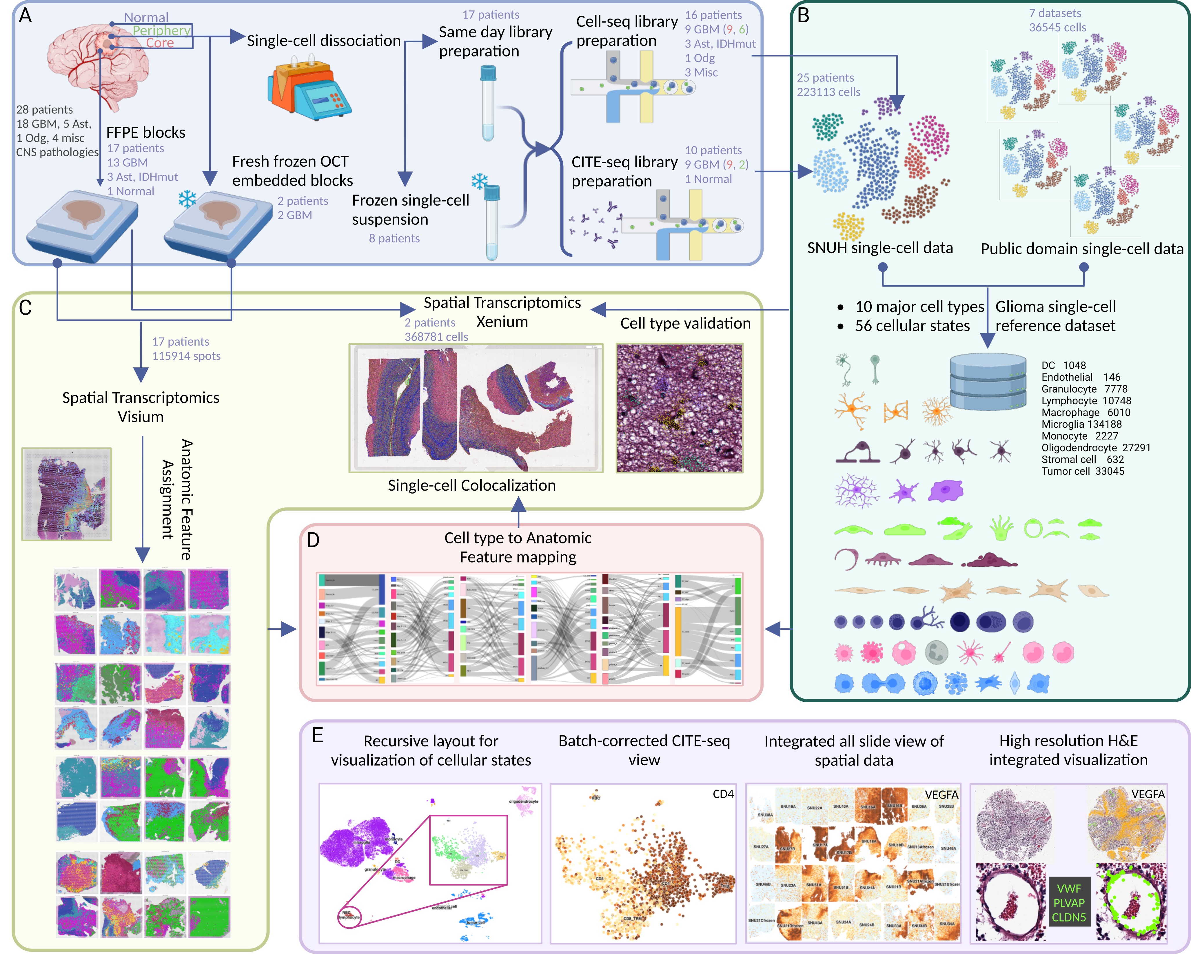 Glioblastoma (GBM) is a dynamic ecosystem with high plasticity where the complex interplay between different cellular components contributes to disease progression. Although single-cell RNA (scRNA)-seq has revealed remarkable cellular heterogeneity of GBM, the spatial organization of its diverse cell types is currently lacking. Here we present a comprehensive dataset of 115,914 spatial transcriptomes across 32 tissue sections with matched multi-omics profiling of genotyped glioma samples. We present spatial maps of 56 fine-grained cellular components, including previously unrecognized oligodendrocyte subtypes and their interactive networks within each anatomical niche. Our data provides novel insights into the cellular architecture of GBM. This valuable and openly shared resource will help develop new and effective combinatorial therapies to target multiple niches simultaneously to improve patient outcomes.